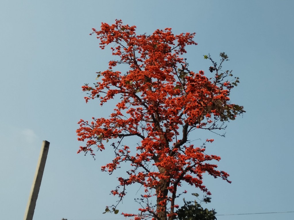 বামনী ফলস দেখতেই আমাদের দুপুর দেড়টা বেজে গেলো আর তাই পেট বাবাজিও খাবার কথা বলতে লাগলো। তাই আমরা অযোধ্যা পাহাড় থেকে নেমে আসলাম নিচে। পাহাড়ের ওপর খাবারের দাম অনেক , তাই আমাদের ড্রাইভার দাদাটি আমাদের নিচে নিয়ে এলেন। এই প্রথম খাবারের জন্য অনেকটা নিচে নামতে হলো। যাই হোক রাস্তার ধারের এক হোটেলে মাছ ভাত পরিপাটি করে খেয়ে রওনা দিলাম পরের গন্তব্য চড়িদা গ্রাম। খাবারের হোটেল থেকে চড়িদা গ্রাম যেতে ৫ মিনিট লাগলো। চড়িদার ব্যাপারে কিছু বলার আগে বলি , রাস্তায় কিছু অপূর্ব পলাশের দেখা পেলাম। বসন্ত কালে পুরুলিয়া আসা আমাদের সার্থক হলো। চোখ জুড়োল পলাশের রূপ দেখে , তাই ঝটপট ক্যামেরাবন্দি করলাম।