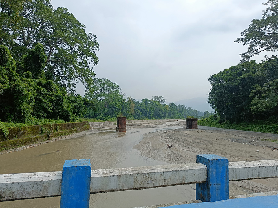 এখানে গাড়ি দাঁড়ালো। স্বপনবাবু দেখালেন, সোজা রাস্তা চলে গেছে সান্তালবাড়ির দিকে, আর জয়ন্তী জনপদ যেতে গেলে, ডানদিকের বাঁক নিয়ে আরেকটি পিচের রাস্তা ধরতে হবে। আমাদের গাড়ি, ডানদিকে চললো। এইদিকে প্রায় পাঁচ কিলোমিটার গেলে তবেই পৌঁছে যাবো জয়ন্তী। এইপথেও উঁচু উঁচু গাছ দিয়ে সাজানো, এই বনাঞ্চলের অনবদ্য শোভা। রাস্তা এখানে খুব ভালো। দশ মিনিট অরণ্যের সৌন্দর্য্য দেখতে দেখতে কেটে গেলো। আমরা পৌঁছে গেলাম এক রিভারব্রীজের কাছে। স্বপনবাবু এখানে গাড়ি দাঁড় করালেন। আমি গাড়ি থেকে না নেমেই দেখতে লাগলাম এই নদীটিকে। অসংখ্য নুড়ি পাথর ভর্তি এই নদীতে। । এটিকে রিভারবেড বলে। গতকালের বৃষ্টির কারণে এখানে একটি শীর্ণকায়, কর্দ্দমাক্ত জলরাশি বয়ে চলেছে। তবে সেই জলরাশির ব্যাপ্তি খুবই সামান্য। পুরো রিভারবেড  জুড়ে বয়ে চলার মতো বৃষ্টিপাত এখনো হয়নি। রিভারবেডের  দুধারে ঘন জঙ্গল। ব্রীজের ওপর থেকে দাঁড়িয়ে আমার বামদিকে আর ডানদিকে দুদিকেই দেখলাম ঘন জঙ্গল। তবে একটা জিনিস লক্ষ্য করলাম, ব্রীজের বাঁপাশে কিছুটা দূরে দুটো স্তম্ভ । আপাতদৃষ্টিতে মনে হচ্ছে, পুরোনো ব্রীজের ভগ্নাংশ। স্বপনবাবুকে জিজ্ঞেস করলাম। উনি জানালেন – ওটি পুরাতন রেল ব্রীজের স্মৃতি। ওই রেল ব্রীজ আর নেই , রয়ে গিয়েছে শুধু ওই দুটি স্তম্ভ। বহুকাল আগে , গৌতম ঘোষের ” আবার অরণ্যে ”  ছায়াছবিতে ওই ব্রীজের বেশ কিছু অংশ দেখা গিয়েছিলো।