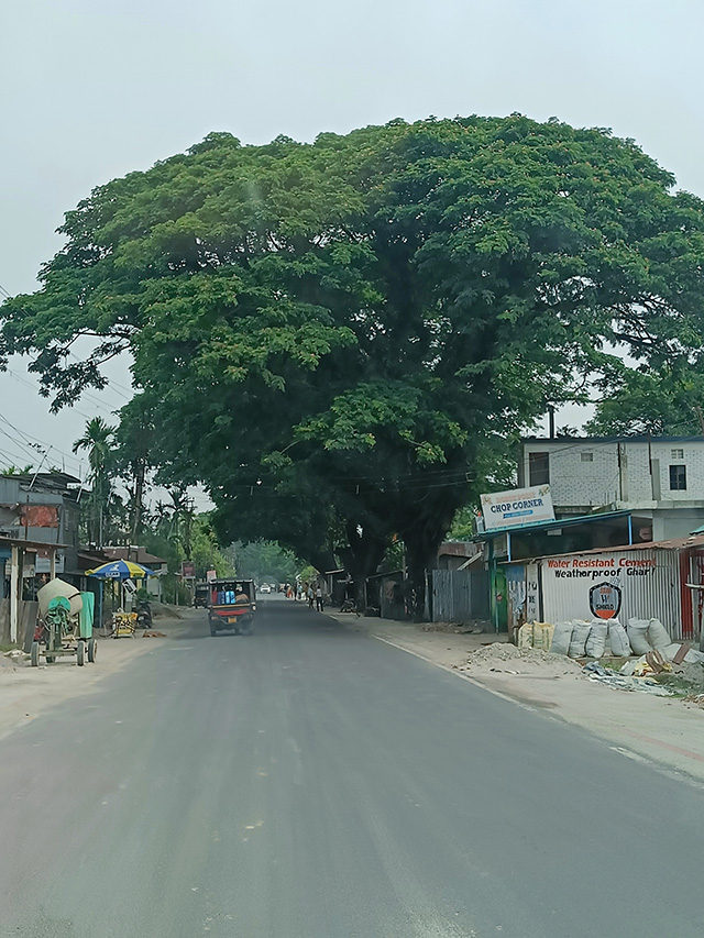 কিছুদূর এগিয়ে যেতেই দেখতে পেলাম এক সুবিশাল বটগাছ। বটগাছের নীচে কয়েকটা দোকানপাট, সেগুলোকে ঘিরে কিছু মানুষের আনাগোনা দেখতে পেলাম। এই বটগাছ এই গরমেও যে ছায়া প্রদান করছে, তাতে অনেকটা জায়গা জুড়ে একটা আচ্ছাদন রয়েছে , মনে হলো।  এই গাছকে কেউ কাটেনি , এমনকি এর কোনোরকম ডালপালাকে ছাঁটাও হয়নি। অবাধে বেড়ে গিয়েছে। বটগাছের নিচ দিয়ে গাড়িতে যাওয়ার সময় দেখলাম রাস্তার ডানদিকে আরেকটি রাস্তা চলে গেছে। তখন বুঝলাম, এটি একটি মোড়। গ্রামাঞ্চলে এই ধরনের জায়গাকে বটতলা বলা হয়।