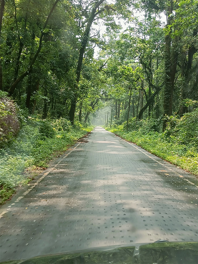 আরো যত এগোতে লাগলাম, দেখলাম পথের দুধারে গাছের ঘনত্ব বাড়তে লাগলো। বাড়ি ঘর , মানুষজন এর সংখ্যা কমে যেতে লাগলো। বুঝতে পারলাম, এ এক অন্য জগতে প্রবেশ করতে চলেছি। নগরজীবন ও নগরায়নের প্রভাব এই এলাকায় প্রায় নেই বললেই চলে। এই জগতে কোলাহল বলতে শুধুই পাখিদের কলকাকলি। পিচ রাস্তা, ভেজা।  স্বপনবাবু জানালেন গতকাল রাতে বৃষ্টি হয়েছিল। যতটা এগোতে লাগলাম, তাপমাত্রাও ধীরে ধীরে কমতে লাগলো। খেয়াল করলাম, একটি ট্রেনলাইন সমান্তরাল পথে আমাদের পাশে পাশে এই অরণ্যগামী পথে চলেছে। স্বপনবাবুকে জিজ্ঞেস করাতে, উনি বললেন – এটিই সেই রাজাভাতখাওয়ার ট্রেন লাইন। এই পথেই, আলিপুরদুয়ার থেকে মাল জংশন হয়ে ট্রেনগুলি শিলিগুড়ি যাচ্ছে। যদিও আমরা এই পথ দিয়ে আসিনি , তবে ফেরার সময় এই পথ দিয়ে ফিরবো।