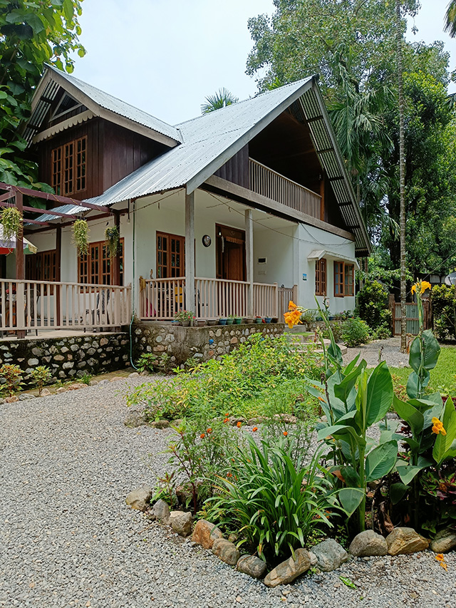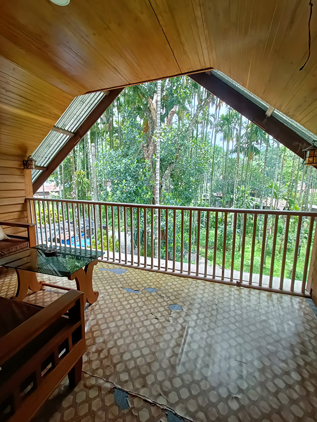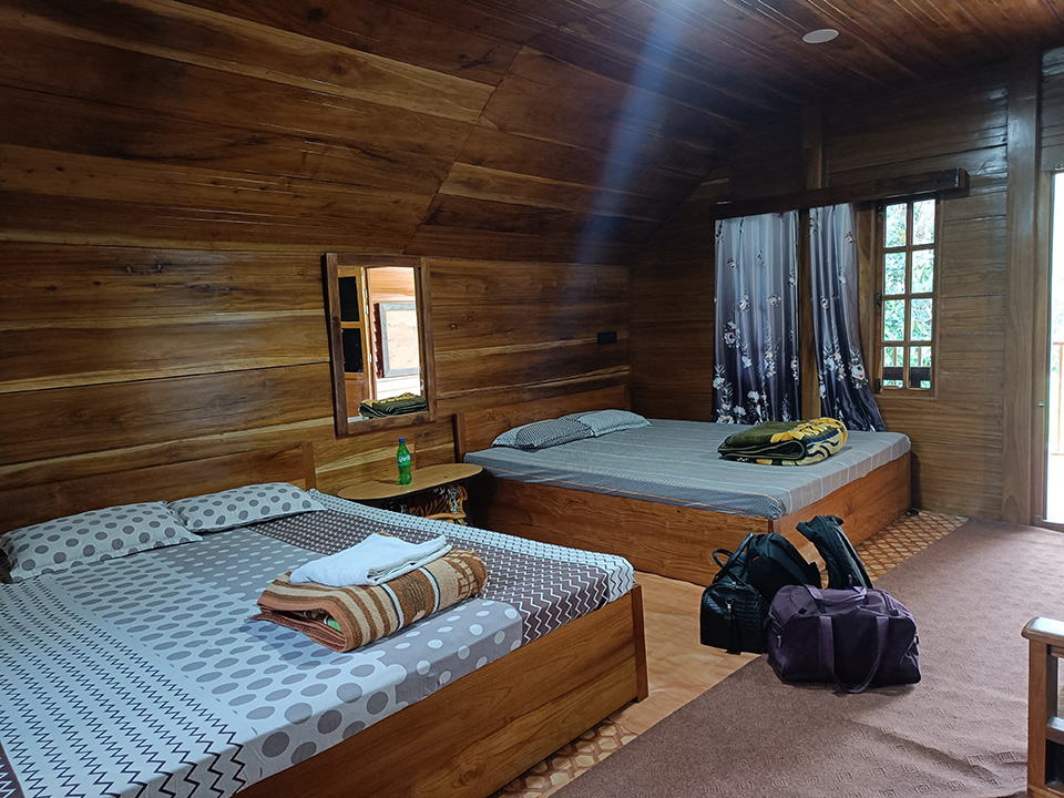 যেরম ইন্টারনেটে ছবি দেখেছিলাম , বাড়িটি তার থেকেও বেশি সুন্দর। বাড়িটিতে ঢুকতেই ডানদিকে একটি দোতলা বাড়ি। এখানে নিচের তলায় বাদল ছেত্রী তার পরিবার নিয়ে থাকেন। সেই বাড়িরই উপরের তলাটা কাঠের তৈরী। আমাদের থাকার জায়গা সেখানে। এই দোতলা বাড়ির একপাশে জঙ্গলের দিকে রয়েছে একটি ট্রি হাউস। কাঠের স্তম্ভ দিয়ে দোতলা সমান উঁচু একটি বাড়ি। দুটি ঘর রয়েছে সেখানে। কাঠের সিঁড়ি দিয়ে উঠতে হয়। এটিও হোমস্টেরই একটা অংশ। এই ঘরগুলোতে ২-৩ জন থাকতে পারে। তবে আমাদের ঘরটা একেবারে আলাদা। বড়কা দা আমাদের লাগেজ আগেই ঘরে ঢুকিয়ে দিয়েছেন। আমাদের ঘর দেখিয়ে দিয়ে বললেন – আপনারা ফ্রেশ হয়ে নিন, আমি জলখাবারের ব্যবস্থা করে দিচ্ছি। এই বলে বড়কা দা চলে গেলেন। দেখলাম, ছবি দেখে ঘরটা যতটা বড় ভেবেছিলাম, ঘরটি তার থেকেও অনেক বড়। দুটো ডাবল বেডের খাট, ব্যালকনি, আরেকদিকে মাদুর পেতে খাবার ব্যবস্থা। বাথরুমও বেশ বড়। আমি এর আগে যেসব জায়গায় থেকেছি, অনেক জায়গায় এই বাথরুমের থেকেও ছোট মাপের ঘর ছিল। আমার পরিবার খুব খুশি হলো। পরিবারের সাথে ঘোরার একটা আলাদা মজা আছে। নিজেকে একটু বেশি সুরক্ষিত মনে হয়, যখন পরিবারের সাথে থাকি। এরই মধ্যে বড়কাদা জানালেন – খাবার রেডি।
