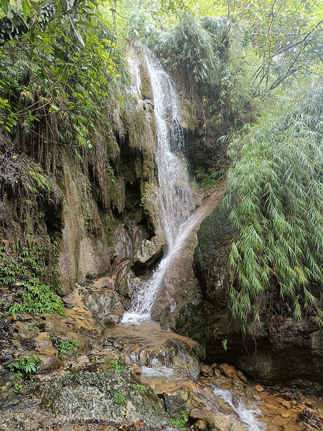 দেখলাম উনি একটু দূরে দাঁড়িয়ে কি যেন দেখাতে চাইছেন। ওনার পিছু নিলাম। কিছুটা এগিয়ে গিয়ে ডানদিকে ঘুরে দেখতে পেলাম এক অপূর্ব দৃশ্য। পাহাড়ের দুটো ঢাল অনেকটা ইংরেজী X অক্ষরের মতো রয়েছে। এক ঢাল থেকে আরেক ঢালে আছড়ে পড়ছে এক শ্বেতবর্ণ জলরাশি।