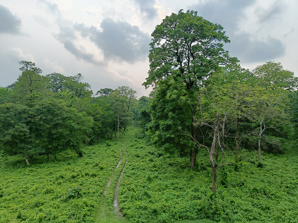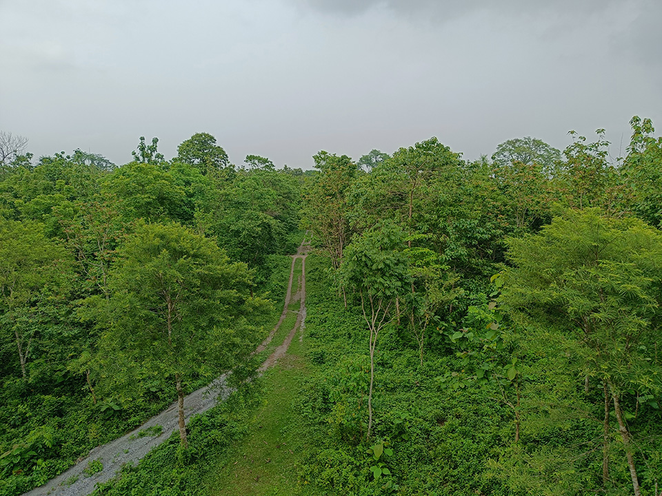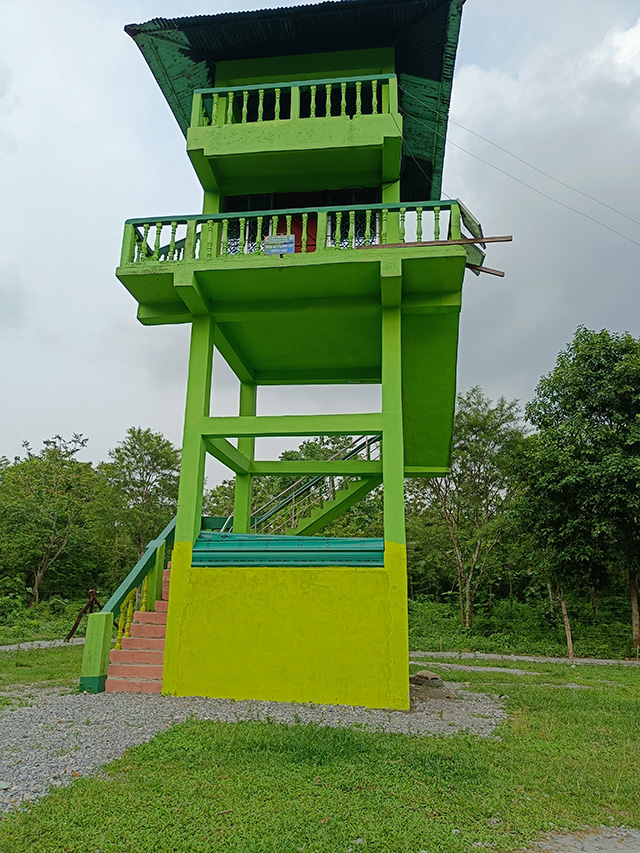 বেশ খানিকটা এগিয়ে এক জায়গায় পৌঁছলাম। এই জায়গাটি মূলত চোরাশিকার ঠেকানোর জন্যে ব্যবহৃত হয়। নতুন করে সবুজ রং করা হয়েছে। ওয়াচটাওয়ারের ওপরে উঠলাম। সামনের বিস্তীর্ণ বনাঞ্চল অতোটা ঘন নয়। তুলনামূলকভাবে পেছনদিকের অঞ্চলে গাছেদের ঘনত্ব বেশী। সামনের গাছের সারি পেরোলে দেখা মিলবে জয়ন্তী নদীর। ওয়াচটাওয়ারের আশেপাশে কেউ কোথাও নেই। শুধু আমরাই। এই নির্জনতাই জঙ্গলকে উপভোগ করতে সাহায্য করে। বট, শাল, পিয়াল, শিশু, শিরীষ গাছের প্রাধান্য বেশি দেখা যায় এই জায়গাতে। টাওয়ারের চারিদিকে ইলেকট্রিক ফেন্সিং দেয়া, তার মধ্যে দিয়ে সাবধানে গলে গিয়ে উঠতে লাগলাম টাওয়ারে। টাওয়ারের দুটো তলা। দুটোতেই লোক থাকার ব্যবস্থা আছে। রান্নাঘর, শৌচালয় সবের ব্যবস্থা আছে। পরিচ্ছন্নতা দেখে বোঝাই যায়, এখানে লোকের বসবাস আছে। টাওয়ারের দোতলা থেকে জঙ্গলের অনেকটা ভেতরে দেখা যায়, তার এক প্রধান কারণ এখানকার গাছেদের ঘনত্ব। চোরাশিকারীদের গতিবিধির ওপর নজর রাখতে এর থেকে ভালো ঠিকানা আর হয় না। টাওয়ার থেকে নেমে এলাম। কোথাও কিছুই দেখতে পাইনি, এক দুটো বুলবুল পাখি ছাড়া। বাদলবাবু আর আমার পরিবার কেউ ওপরে ওঠেনি। নেমে আসতেই বাদলবাবু জিজ্ঞেস করলেন – কিছু দেখতে পেলেন নাকি স্যার?