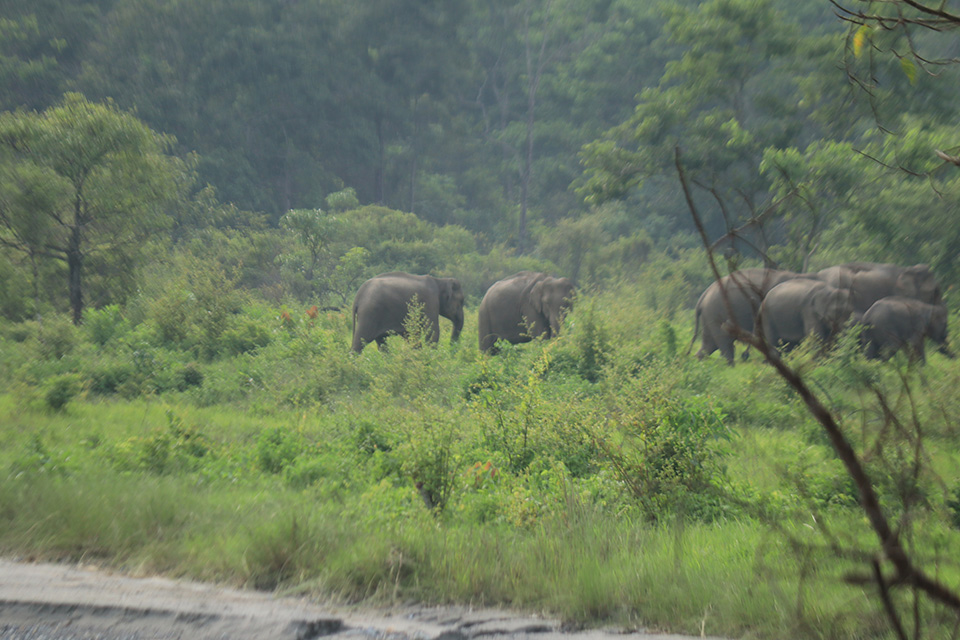 গাড়ি পঞ্চাশ মিটার এগিয়েছে কি, আমাদের চলার পথের ডানদিকে যে ফাঁকা ঘাসের জমি ছিলো, সেইখানে চোখ গেলো। চেঁচিয়ে উঠলাম – ওই যে, ওই যে, গাড়ি দাঁড় করান। বাদলবাবু সজোরে ব্রেক কষলেন। উনি খেয়াল করেননি, কারণ এই হাতির দল আমাদের পেছনে ছিলো। বড়ো হাতি আর বাচ্চা হাতি মিলিয়ে গোটা আটেকের দল হবে। হস্তীপরিবার নিজের বাচ্চাদের নিয়ে হাঁটতে বেরিয়েছে। ক্যামেরাবন্দী করে নিলাম তাদের এই সুন্দর মুহূর্তকে। ছবি তোলার পর মনে হলো, পারিবারিক এই মুহূর্ততে হয়তো আমরা বিঘ্ন ঘটাচ্ছি। আমাদের উপস্থিতি টের পেয়ে মিনিটখানেকের মধ্যেই হাতির দল আবার জঙ্গলের মধ্যে ঢুকে গেলো। আমরাও এগিয়ে চললাম চুনিয়া ওয়াচটাওয়ারের দিকে।