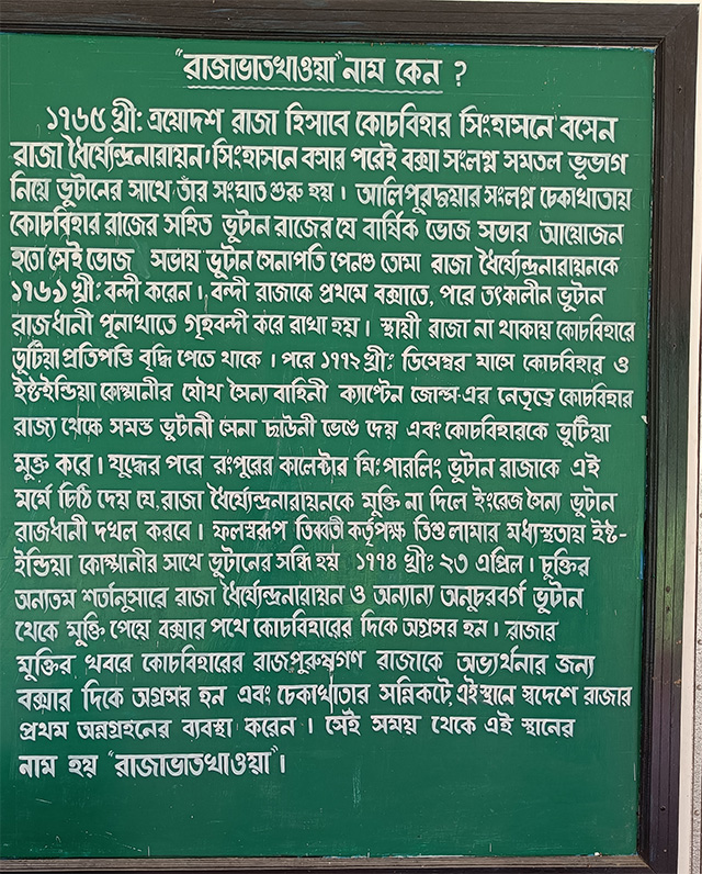 ১৭৬৫ খ্রীষ্টাব্দে কোচবিহারের রাজ্ সিংহাসনে বসেন রাজা ধৈর্যেন্দ্র নারায়ণ রায়। তিনি সিংহাসনে বসার পর থেকে এই বক্সা এলাকা নিয়ে ভুটানের রাজার সাথে মতবিরোধ হতে থাকে। সীমা সংলগ্ন অঞ্চলগুলিতে ঝামেলাও বাড়তে থাকে। এরই মধ্যে ১৭৭২ খ্রীষ্টাব্দে দুই পক্ষের সহমতে অনুষ্ঠিত এক বার্ষিক সভায়, কোচবিহারের রাজাকে বন্দী করেন ভুটানের রাজা। তাকে ভুটানের তৎকালীন রাজধানী পুনাখা তে গৃহবন্দী করে রাখা হয়। এদিকে স্থায়ী রাজা না থাকায় , ওই ঘটনার পর থেকে কোচবিহারের বিভিন্ন এলাকায় ভুটিয়া প্রতিপত্তি বাড়তে থাকে। পরে ১৭৭২ খ্রীষ্টাব্দে , কোচবিহার এবং ইস্ট ইন্ডিয়া কোম্পানির যৌথ উদ্যোগে রাজ্য থেকে সমস্ত ভুটিয়া সেনাছাউনি ভেঙে দেয়া হয়, তৎপর কোচবিহারকে ভুটিয়ামুক্ত করা হয়। এই ঘটনার পরে রংপুরের কালেক্টর ভুটানের রাজাকে চিঠি দেন যাতে রাজা ধৈর্যেন্দ্র নারায়ণ রায়কে ছেড়ে দেয়া হয় , নয়তো ইস্ট ইন্ডিয়া কোম্পানি ভুটানের রাজধানী দখল করবে। এর ফলে, তিব্বতী কর্তৃপক্ষ তিশু লামার মধ্যস্থতায় , দুই পক্ষের সন্ধি হয়। সন্ধির তারিখ ২৩শে এপ্রিল , ১৭৭৪ খ্রীষ্টাব্দ। চুক্তির অন্যতম শর্তানুসারে রাজা বক্সার পথ দিয়ে কোচবিহারের দিকে অগ্রসর হন। তখন সেই খবর পেয়ে কোচবিহারের রাজপুরুষেরা এগিয়ে যান রাজাকে অভ্যর্থনা জানাতে। এই জায়গাতেই রাজার স্বদেশে প্রথম অন্নগ্রহনের ব্যবস্থা করা হয়। সেই থেকে এই জায়গার নাম রাজাভাতখাওয়া।