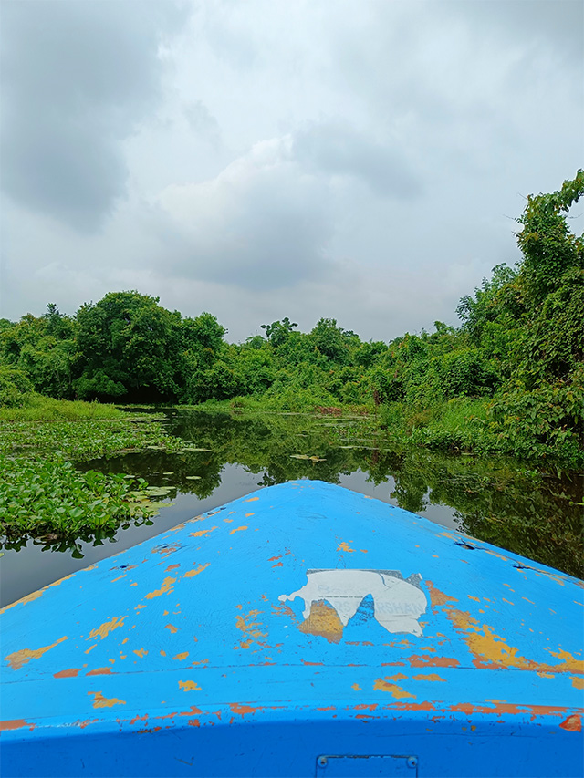 অল্পবিস্তর যা পাখি চিনি , তাতে দেখলাম একটা স্টর্ক বিলড মাছরাঙা আমাদের থেকে কিছুটা দূর দিয়ে উড়ে গেলো। দেখলাম খানিকটা দূরে একটা ছোট্ট ওয়াচটাওয়ারের মতন রয়েছে , সেইখানে পাখিটা গিয়ে বসলো। তবে সেই টাওয়ার ক্ষতিগ্রস্ত , মানুষের চড়ার মতো একদমই নয়। দেখলাম এক ভদ্রলোক এলেন , এনার পরনে টিশার্ট এবং একটি হাফপ্যান্ট। কোমরে গামছা বাঁধা। কোনো কথা না বলেই বাঁশের দাঁড় উঠিয়ে বোট ঠেলা শুরু করলেন। গাইড ভদ্রলোকও যেন এই মুহূর্তের জন্য অপেক্ষা করছিলেন। তিনিও শুরু করলেন, এই জায়গার ভৌগোলিক অবস্থান , কি কি আছে এইসব সম্পর্কে তথ্য বিতরণ করতে লাগলেন। লক্ষ্য করলাম ভদ্রলোকের পরনে যতই মলিন কাপড় থাকুক না কেন , ওনার মুখের হাসি একেবারেই অমলিন। ভালো লাগলো সেই মুখের হাসি । জিজ্ঞেস করলাম – ” আপনার নাম কি ? ” , উত্তর এলো – ” স্যার , আমার নাম অনন্ত রাভা , কাছাকাছিই আমাদের গ্রাম। “